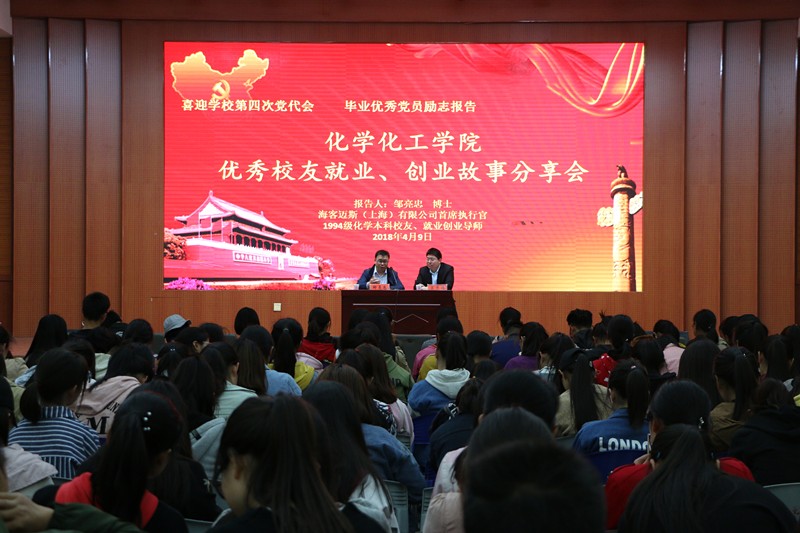 为喜迎学校第四次党代会,4月9日,英国正版365官网在逸夫楼报告厅举办了优秀校友就业创业故事分享会。此次分享会邀请了海客迈斯(上海)生物科技有限公司首席执行官邹亮忠博士(94级化学校友、毕业优秀党员、英国正版365官网现任就业创业导师)为大家做励志报告。学院党委书记郭鹏与400余名化院学子参加了此次报告,报告由英国正版365官网党委副书记吴志伟主持。